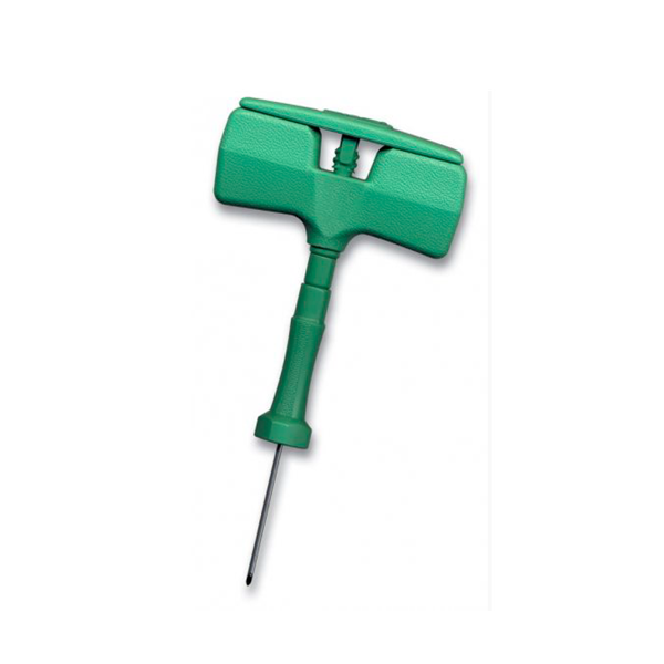 - double cutting needle edge (Quincke type) with depth marks and with ergonomic grip (it ensures safe grip and manoeuvrability and force distribution on the palm of the hand)